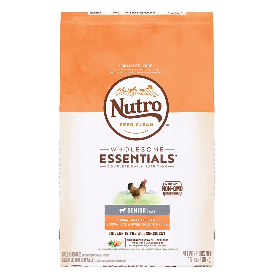 Nutro wholesome essentials large breed senior dry dog food farm raised chicken brown rice sweet potato recipe.